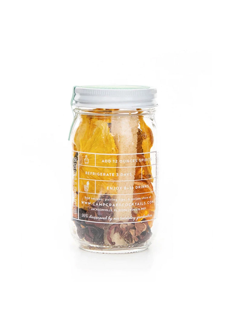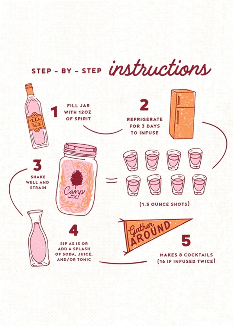 Each Camp Craft Cocktails Base Camp Kit includes: one infusion ready jar, custom ingredients, and are ready to go. Alcohol is not included. These Base Camp Kits serve 8, and can be infused twice for a total of 16 servings!
