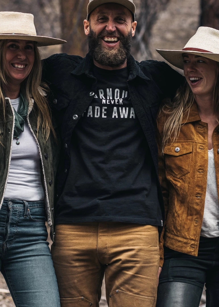 - Iron & Resin custom screen printed “Burnouts” graphic on front chest