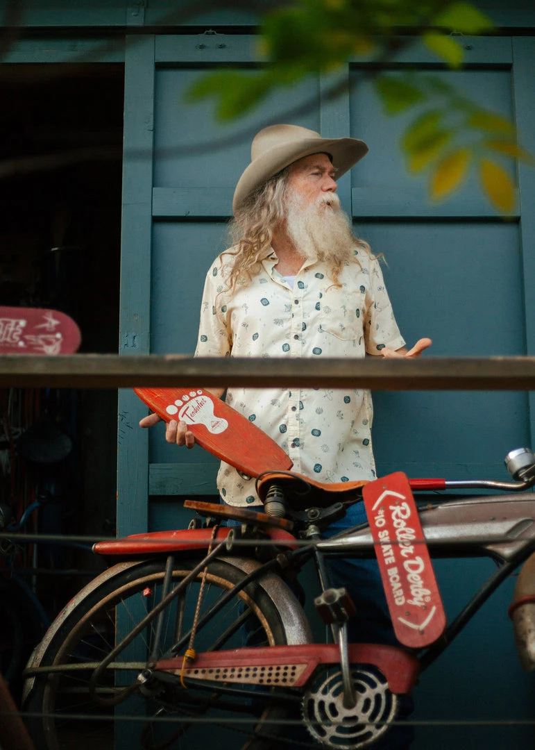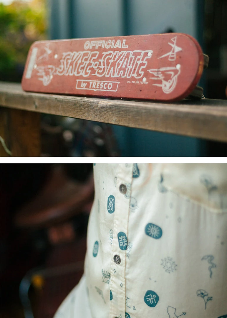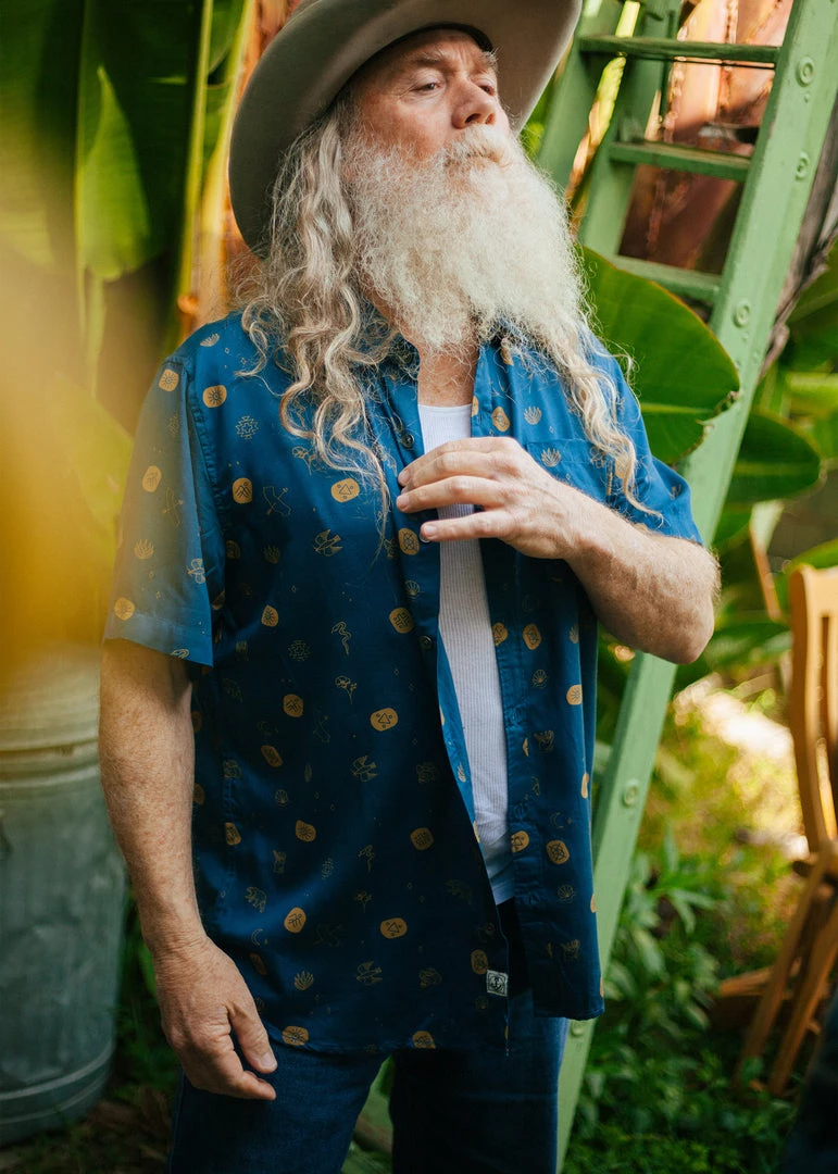 - Lightweight 100% Lyocell button-up with our custom Iron & Resin “Hallow” print