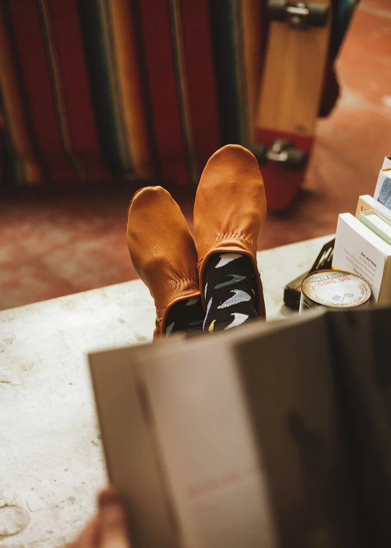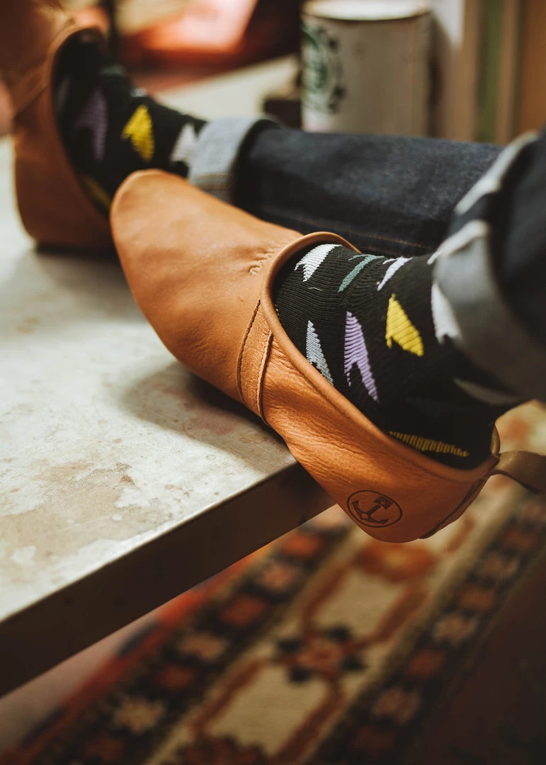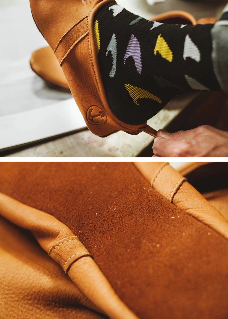 If you’ve ever heard stories from your grandfather about wearing deerskin moccasins around the family cabin in the dead of winter, well he wasn’t joking. They have to be one of the most comfortable pair of slips we have ever put on. In collaboration with Sullivan Gloves out of Bend, OR, these were literally hand cut, and hand sewn, per each size that we ordered. Made from a 2.5 – 3oz American deerskin for that luxurious soft feeling, with an insole made of memory foam, these are the bee’s knees.
