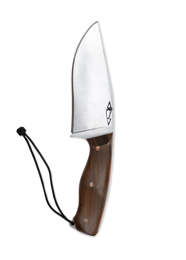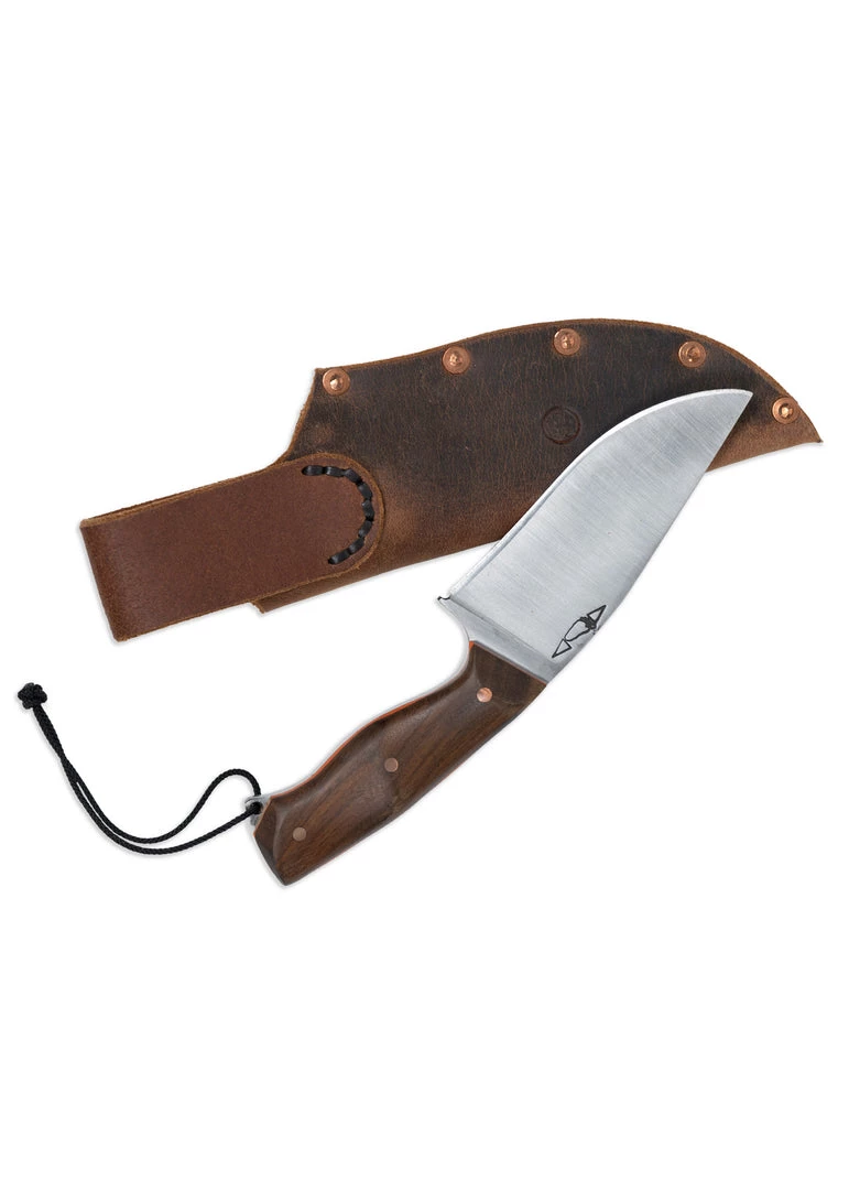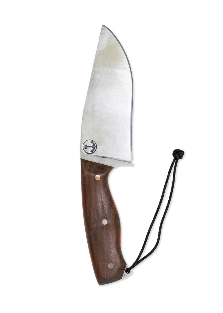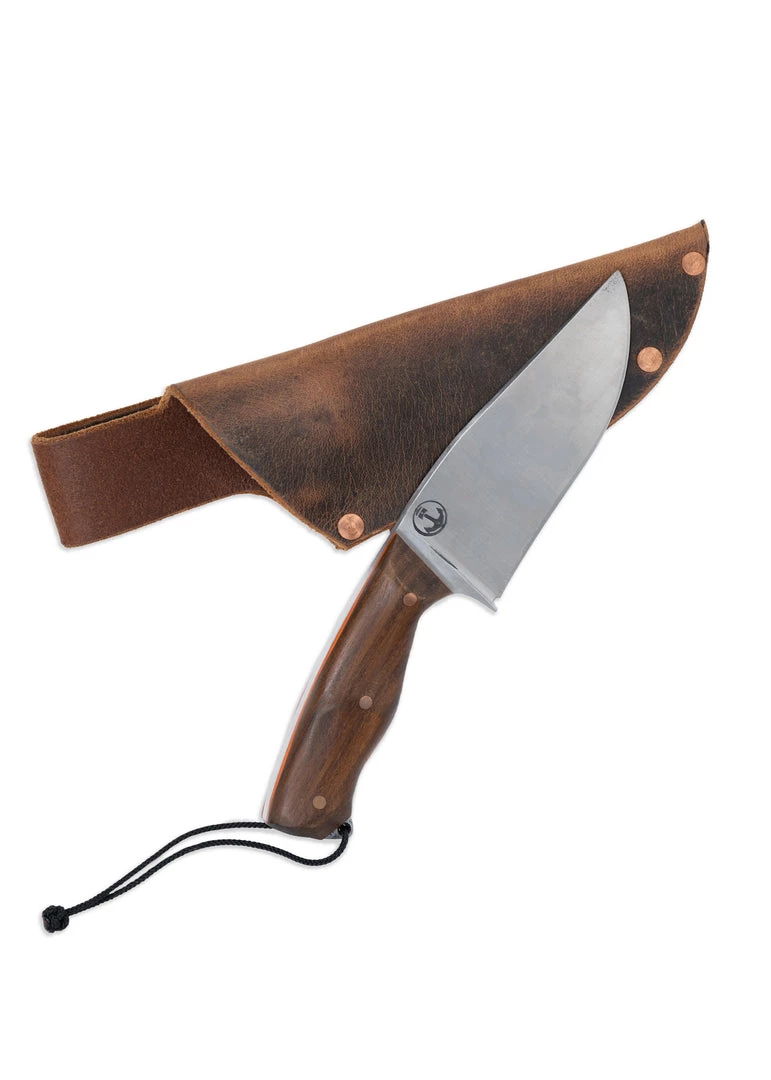 A modern take on the bowie knife, this piece has all the chopping capabilities of a small hatchet. The Black Bear comes in at 9.5″ in total length, making it our largest blade to come with a belt loop sheath. With a 1/4″ thick spine, this one has plenty of weight for all your chopping needs, and with a small recurve belly on the edge this one is still thin enough to serve as a steak knife.