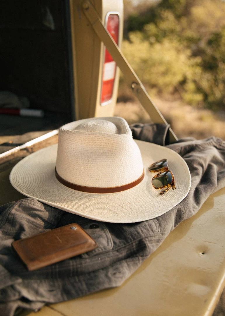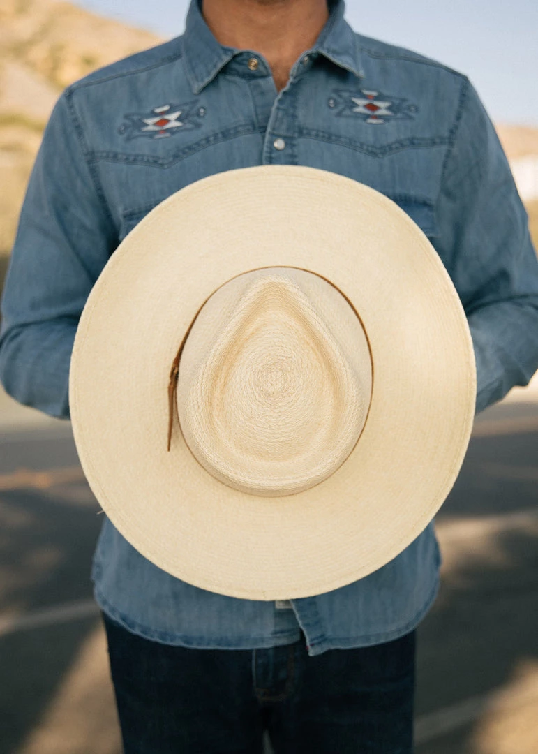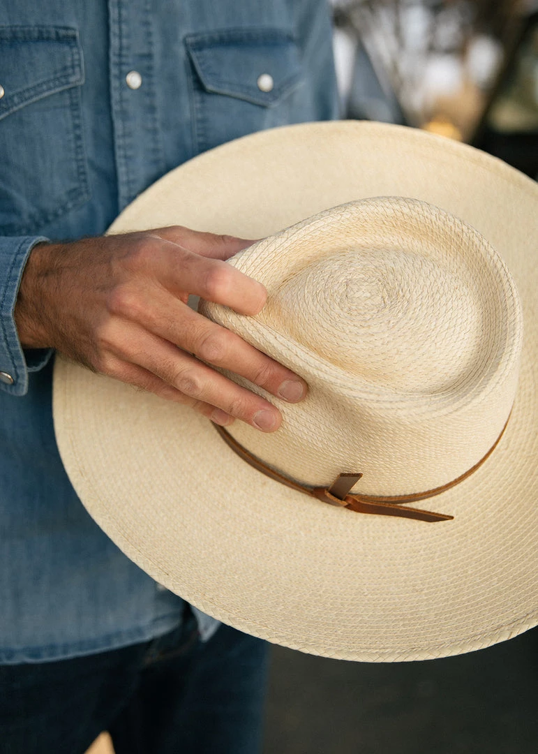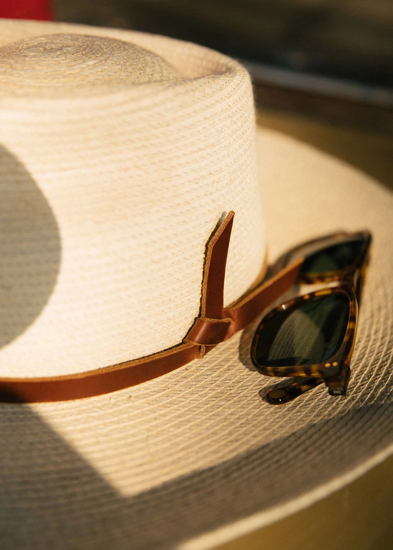 Offering the widest brim in our Iron & Resin x Salt Ranch collaboration, the Californio will give you the most shade in the sunniest of situations. This 4” brim will be hand-shaped for a slight turn up on both sides, complimented by a 4 1/2” teardrop crown. We finished the Californio off with a hand-cut and hand-tied harness leather hat band that’s been secured with blood-knot. The harness leather band has actually been “hot stuffed,” a process of using a blend of waxed, oils, and tallows to permeate the actual leather – this makes it a bit more supple and highly weather resistant.