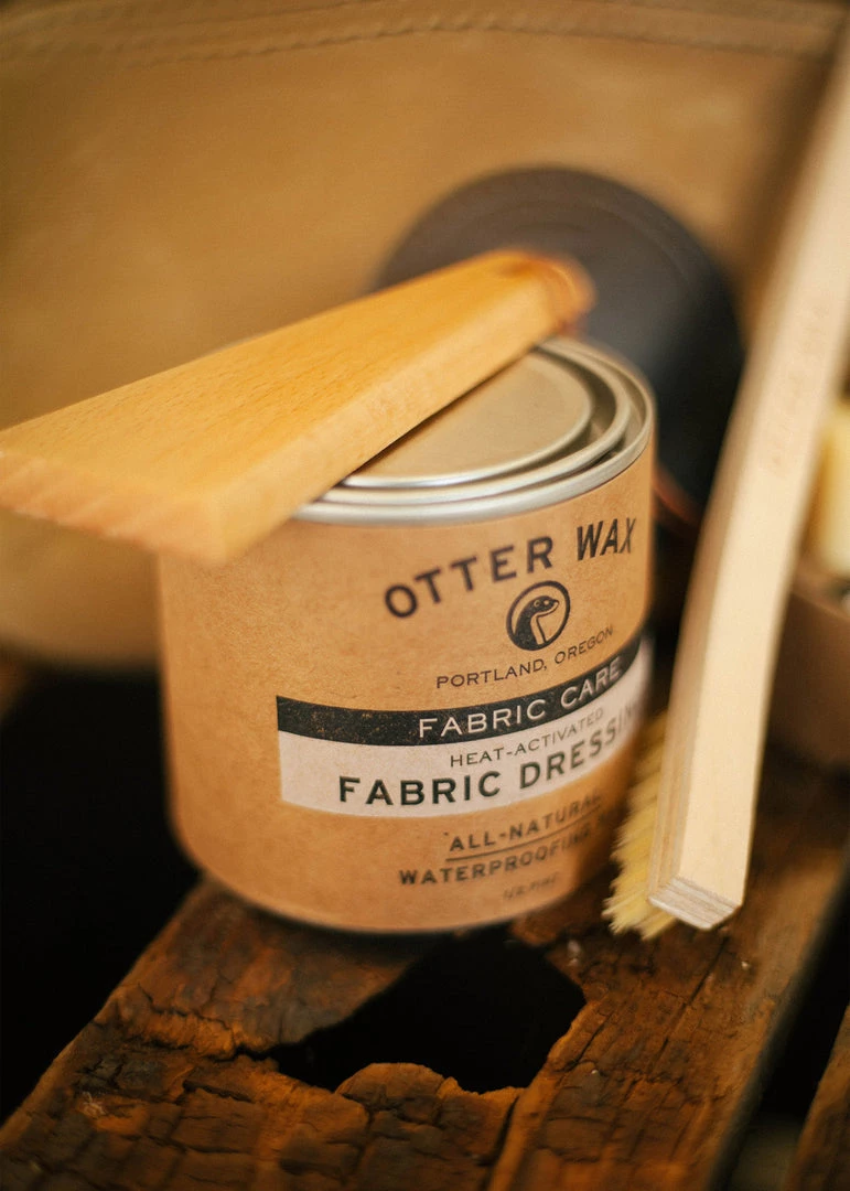 We carry Otter Wax’s Heat-Activated Fabric Dressing because we love the matte appearance it provides as an end result. It comes in a large 1/2-pint tin container so it’s great for those bigger waxed care projects. Great for waterproofing unwaxed items and great for re-waterproofing any existing waxed cotton canvas items. Like all of Otter Wax’s care products, this is an all natural wax blend. Applies easily after melting/heating up with a natural-bristle paint brush, soft cloth and some good ol’ fashion elbow grease.
