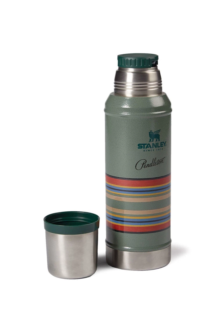 Stanley’s classic vacuum bottle adorned with stripes from Pendleton’s top selling Yakima Stripe Blanket. Built to last, this sturdy bottle has double-wall insulation to keep drinks hot or cold for hours. Screw top with an insulated cap that doubles as a handy 8-oz. cup. Wide mouth for easy filling. Stainless steel is rust-proof and BPA–free.